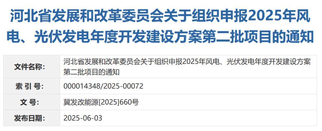 河北省发展和改革委员会关于组织申报2025年风电、光伏发电年度开发建设方案第二批项目的通知