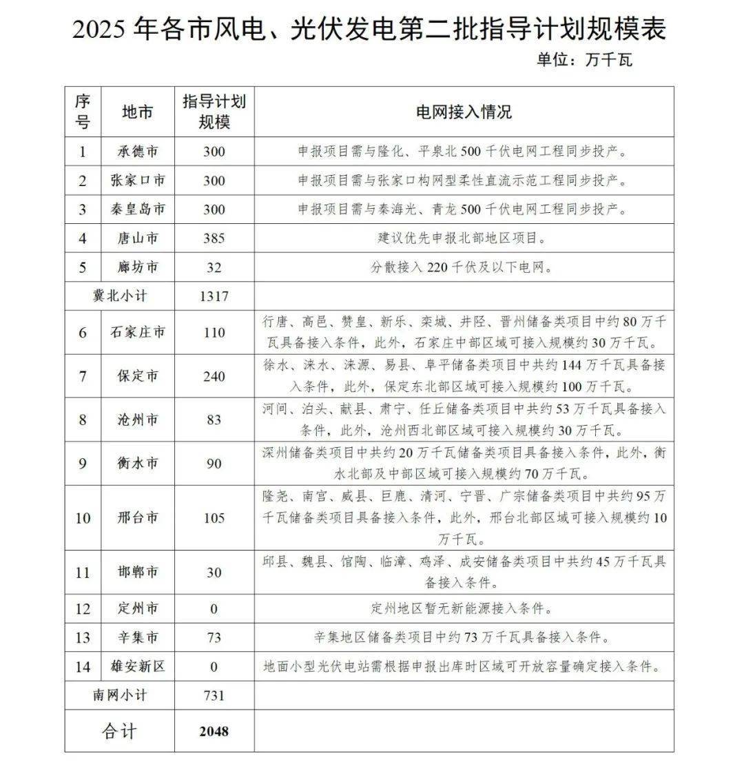 综合考虑国家和省定目标,经征求各市及省级电网公司意见,本次全省拟安排风电、光伏发电指导计划规模2048万千瓦,按照《关于深化新能源上网电价市场化改革促进新能源高质量发展的通知》(发改价格〔2025〕136号)有关要求,不再区分保障性和市场化规模,各市指导计划规模详见附件。