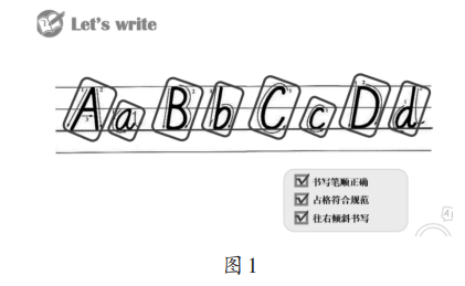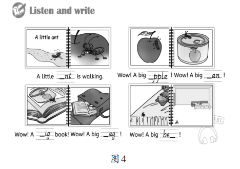 教师播放故事录音,学生边听故事,边在任务单上完成任务,在四线格上书写缺失字母(如图4)。完成后,教师利用投影示范批改学生的练习,随后同桌两人互相评价。