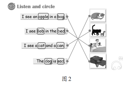 教师引导学生复习拼读 apple、dog,帮助学生理解the first sound的意思,为教材中Listen and circle the first sound 活动做铺垫。随后,教师播放该部分教材的音频,学生在书上完成练习,一名学生上台同步完成。