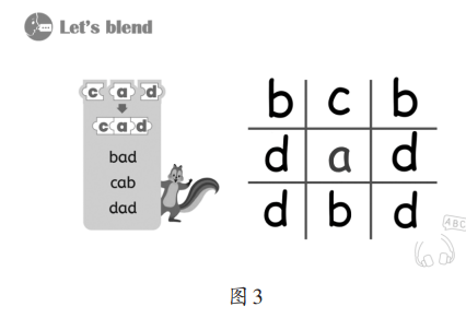 教师先请学生利用任务单上的九宫格相互练习拼读,然后请一名学生上台指着板书上的九宫格带领全班拼读(如图3)。