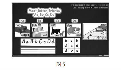 三年级学生虽然可能接触过英文字母,但没有经过系统学习,对其认知并不全面和深刻。因此,教师从初学者视角出发,针对字母的发音、书写及拼读法等方面制定了适当的教学目标。本节课作为第一节字母学习启蒙课,让学生通过直观的视听输入,认识字母,感知字母 Aa-Dd 的发音特点,达成对字母Aa-Dd的认读目标;同时,通过多模态的教材资源帮助学生了解 Aa-Dd 大小写形式,借助肢体动作加深对字母字形的印象,运用教材字母Aa-Dd书写视频,引导学生归纳书写要点,掌握目标字母在四线格上的书写规范,达成对目标字母的书写目标;在掌握字母的音、形之后,学生通过听音选图、听音圈词等活动,归纳字母Aa-Dd在单词中的发音规律并开展趣味拼读练习,达成掌握字母拼读法的目标。