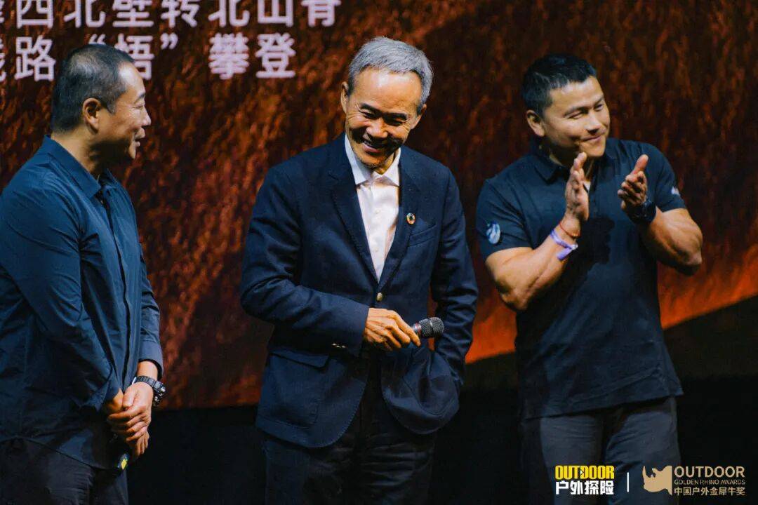 《户外探险》杂志与媒体出版人,中国户外金犀牛奖组委会主席吕晖(左一);万科集团/深石集团创始人,万科公益基金会理事长,深圳市登山户外运动协会创始会长王石(中间);巅峰户外运动学校校长,巅峰探游创始人,第十九届金犀牛奖最佳攀登成就奖评委孙斌(右一),三人在现场互动。