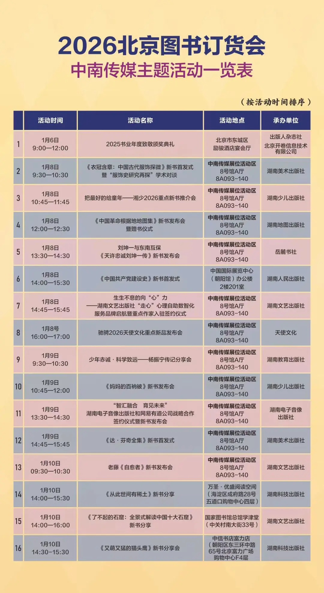 《全民阅读促进条例》将于2026年2月1日起施行。在此背景下参展北京图书订货会,中南传媒以读者为中心,精心策划推出16场形式多样、内容丰富的主题活动,邀请行业领导、著名作家、知名学者共襄文化盛宴,以精准服务对接市场需求,力争实现“湘书出圈、合作共赢”的参展目标。