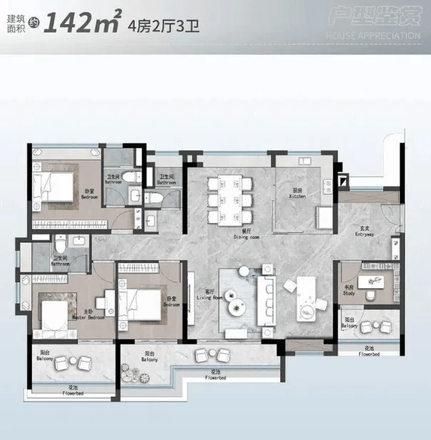 改善家庭可以重点关注142㎡四房两厅三卫户型,这款户型在空间舒适度和私密性上都实现了全面升级。户型做到了四开间朝南,采光面非常大,让房间的每个角落都能享受到充足的阳光。6.8米的阳台横跨客厅和次卧,空间感十足,早上晒被子、傍晚观景都很方便,还能作为家庭的“空中花园”,种种花、养养草,享受惬意时光。
