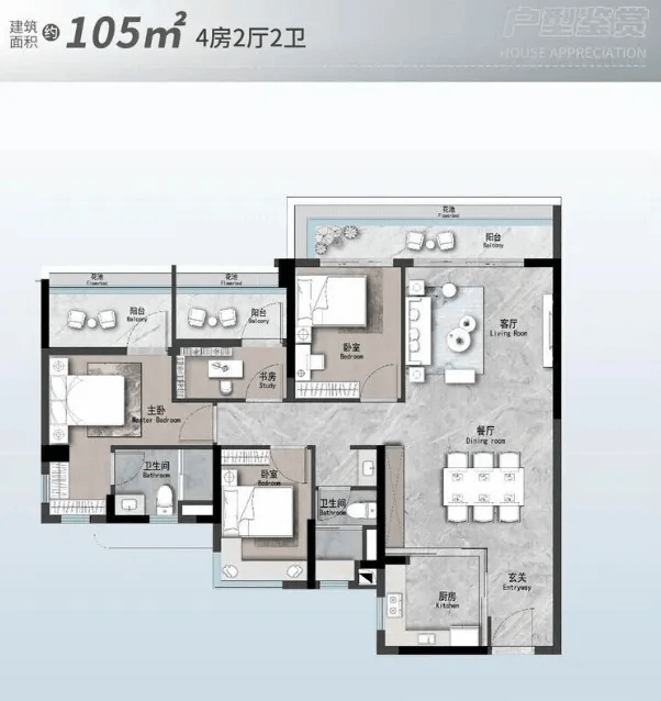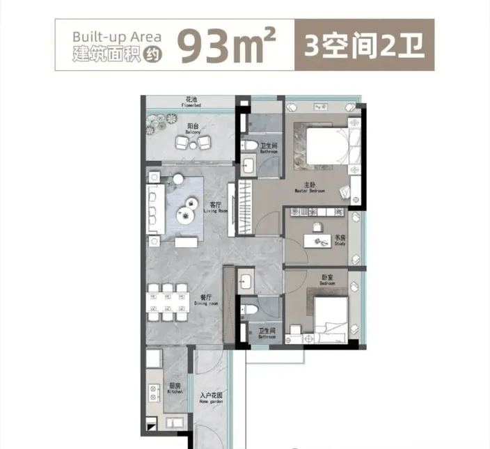 103㎡四房两厅两卫户型,更适合计划生二胎的家庭。户型采用LDK一体化设计,让餐客厅空间显得非常开阔,家人之间的互动交流更加顺畅。南北对流的格局是岭南地区的“黄金户型”,在炎热潮湿的夏天特别实用,能让室内空气干爽不闷热,告别潮湿困扰。