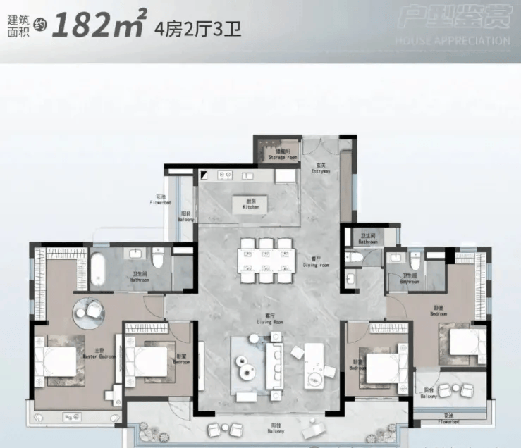 181㎡五房两厅三卫户型则适合人口较多的大家庭居住。户型采用横厅设计,让客餐厅形成7米的阔绰空间,朋友来访也有足够的活动区域,尽显主人的格调与品味。五个房间都能满足居住需求,无论是三代同堂还是多孩家庭,都能轻松容纳。