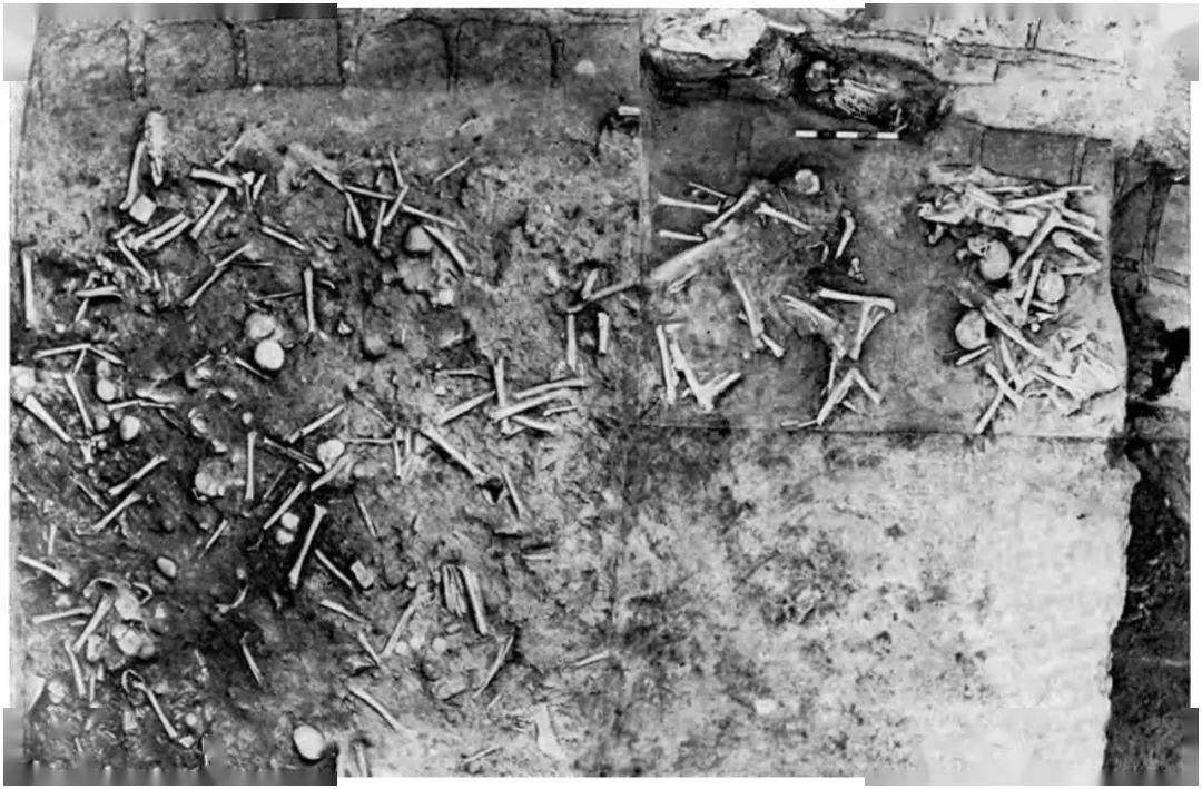 城内其他公共建筑也经历了类似的被破坏、重新利用、改建等变化,原来的功能几乎都被废弃,成为新来人群的生活区和作坊区。下城南部的贵族住宅和城外北部的居址也被改造成为更适合后来者生活居住的结构。[43]值得一提的是主街东侧偏北的剧院。发掘者在剧场前部表演区和观众席第一层台阶处发现了大量散乱的骨骼,主要是长骨和颅骨,以颅骨计算数量,有一百多具骨架(图五)。这些骨骼叠压在第二阶段地层之上,没有明显的墓坑,上覆一层薄薄的泥土和碎石块。发掘者对这一现象给出了两种可能的解释:一是中亚本地的天葬习俗遗迹;二是被入侵者屠杀的本地人的骨骼。从发掘者公布的现场照片来看,骨骼大多非完整个体,显然是二次葬;但骨殖腐朽的程度较为均匀,似乎是在短时间内堆积到一起,并非长期天葬弃置而成。兼之天葬在中亚的习见做法是将尸体放置在较高处的天葬台让鸟兽啄食,待尸肉尽去后,还需再将骸骨收入纳骨器盛敛。因此,总体而言,我们认为,不能完全排除第二种解释的可能性,即此地曾发生外来者入侵事件,造成了大量骸骨。不过,这些乱葬骨骼之上又叠压了新的居址,旁边还有同时期的陶窑,居址可能就是窑工的居处。为城市供水的渠道从剧院穿过,在第二阶段后期堵塞,到第三阶段又在旁边挖通了新的渠道。[45]