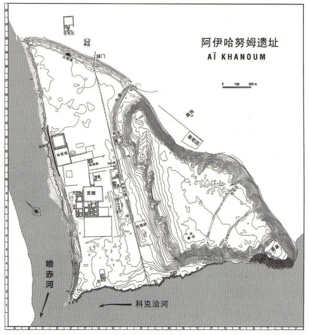 阿伊·哈努姆平面呈三角形,长1.8公里、宽1.6公里,整体面积近1.5平方公里,有城墙环绕,背山面河,十分险固,并非一次性建成。整座城址可分为三个部分:城堡、上城和下城。城堡位于东南角,发现有阿契美尼德风格的建筑遗迹和第1期陶片,属于阿伊·哈努姆最早修建的部分。这里可能曾在亚历山大时期作为一个小戍堡被使用,但规模非常有限。[33]上城地势较平,城内经过发掘的遗迹不多,仅南部有一处露天平台,可能是伊朗系宗教的礼拜场所;另外还有10余处房址。下城的发掘较为彻底,已探明一条横贯南北的中央大道,大道以西由南向北依次分布着住宅区、宫殿区、神庙、陵墓、英雄祠、体育馆等,大道以东还发现了武器库和一座半圆形剧场。墓地在城外的东北部,旁边有葡萄园。中央大道正对着北城门,北城门外还发现了住宅区和另一处神庙。