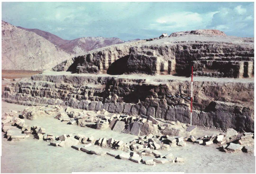 格外值得注意的是,在第三阶段,位于主街中部以西的主神庙也被外来人群利用,并且可能注入了新的宗教内涵。这座神庙正立面装饰有凹龛,被称为“凹龛神庙(Temple with indented niches)”,坐在三层高台上,内室中供奉着主神像,可能是宙斯或一位融合了希腊与东方元素的神祇。神庙三面均有建筑环绕形成庭院,可能是神职人员的生活区。庭院正门开在东侧中部,通向主街,门内不远设有一处祭坛(Altar),庭院东侧建筑还有一处小殿堂(Chapel)。到了第三阶段,与其他城内公共建筑一样,神庙所在区域也被后来者占据、改建,出土了大型储存罐和大量磨石,成为生产、生活区。[48]不过,神庙本身和东侧的小殿堂却被保留了下来,发掘者认为这表明后来人群可能继续使用这座神庙作为宗教场所。他们修缮了神庙的外墙(图六),但拆除了内室的主神像和庭院门内的祭坛,应是用自己的崇拜形式取代了原有的供奉神像。小殿堂内原本也供奉着神像,[50]在第三阶段被拆除,代之以灶。这些现象表现出反对偶像、崇拜火的倾向,可能与伊朗宗教中的一些派别有关,应是大夏本地的宗教传统。