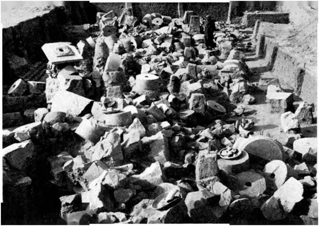 到了第三阶段,这个区域却被平民占据,成为了手工业活动和生活起居空间。宫殿本身被废弃,变为一个原材料产地,人们不再将其看作显贵之地,而只是从中切割石材、掠取金属等材料。发掘时的情景表明,希腊式建筑石材被大量拆除,无论是山门、庭院、列柱大厅还是宫殿生活区所用石材,几乎不见保存完整的立柱、门廊或其他建筑结构(图四)。甚至连陵墓的穹顶、立柱、石棺也遭到了洗劫。体育馆和城外私人住宅等其他地方的石材也被破坏或运走。除了石材,陶瓦、烧砖等建材,陶器等日用品和金属、玻璃、宝石等贵重物品,也被拆除、收集、集中存放,以备后续使用。宝库原本就是放置珍稀物品之处,这一时期其他地点的金属物品也被运到这里集中起来。[35]