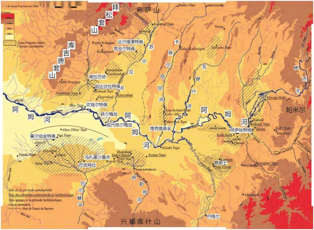 或许正是基于这种地理条件上的相似性,在历史上的很多时期,阿姆河南北两侧被划入一个文化地理单元。巴尔赫河下游坐落着这一地区面积最大的绿洲,自然成为了该区域的中心。在阿契美尼德王朝时期,这里成为了古波斯帝国的一部分,大流士一世的贝希斯敦铭文中记录了这个东方行省,称其为“Bāxtri”,琐罗亚斯德教经典《阿维斯塔》中亦可见到这个地点,其名称应即来自巴尔赫河。公元前4世纪上半叶,马其顿的亚历山大大帝征服了这里。希腊人承袭了波斯人对这一地区的称呼,其希腊语形式即更为人所熟悉的“巴克特里亚(Bactria)”。在古典作家的笔下,阿姆河是巴克特里亚和其北部的索格底亚那(Sogdiana)的分界线。若果真如此,则巴克特里亚与张骞所言“大夏”大致重合。然而,张骞曾提到大夏“往往城邑置小长”,斯特拉波(Strabo)亦曾将巴克特里亚称为“千城之地”,那么这一地区在当时应是城郭林立的局面,而根据考古发现,阿姆河北岸的城址数量非常多,甚至超过南岸。因而,学术界采用了一种较模糊的做法,认为西方史家在使用地名概念时,其范围并不准确,在将巴克特里亚指代“阿姆河以南”时,是指代该地首府所在即巴尔赫绿洲,而巴克特里亚的文化影响可以到达阿姆河北岸,索格底亚那也经常处于巴克特里亚政权控制之下,二者共同构成了中亚绿洲向草原世界过渡的缓冲地带。目前大多数学者是将索格底亚那和巴克特里亚的分界放在了希萨尔(Hissar)山德本特(Derbent)镇、玄奘所称“铁门关”之处。本文亦遵从这一通行做法,认为广义的大夏或巴克特里亚将阿姆河上游南北两侧均包含在内。[3]